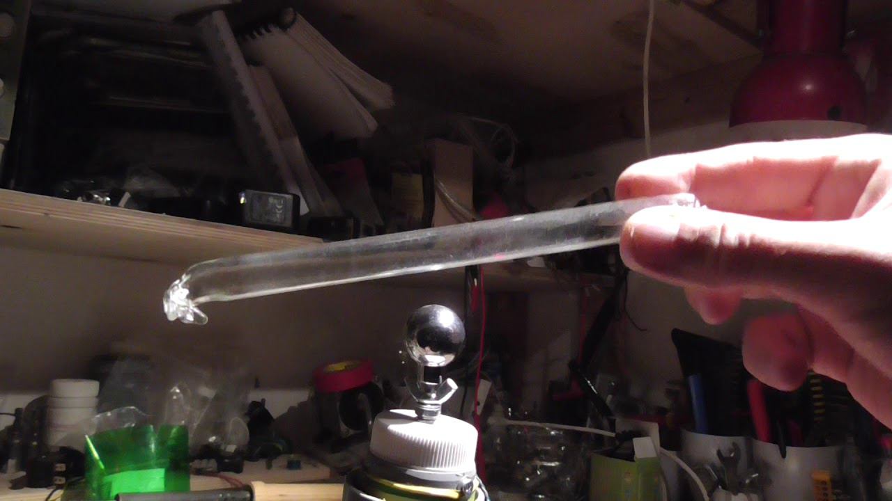Удачный опыт по запайке стеклянных трубок с разрежённым воздухом Уверенно получается запаивать тоненькие трубочки и наконец-то удалось запаять пробирку. Получилась "волшебная палочка" для качера. :) Обновление: в итоге большая к утру всё равно разгерметизировалась. :(