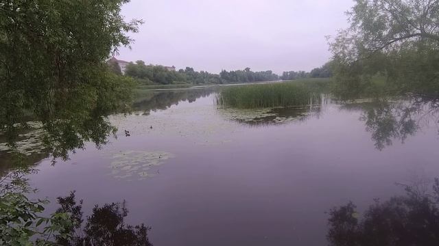 У нас прошёл летний дождь , прогулка к реке . Мама утка с потомством на пантоне .