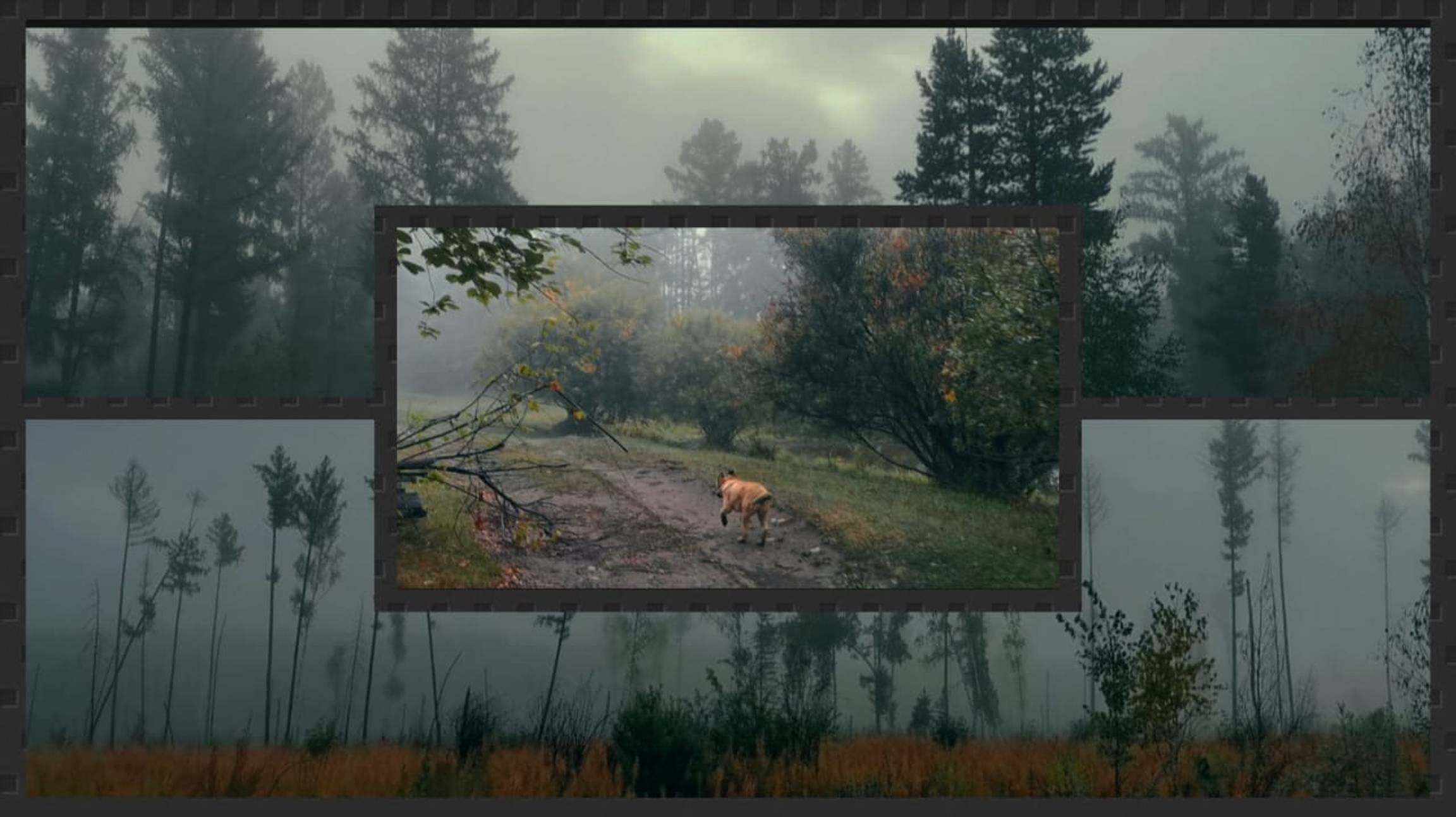 густой красивый туман в сибирском лесу. Собаки резвятся, бегают , гуляют по лесу довольные. природа в своей красе