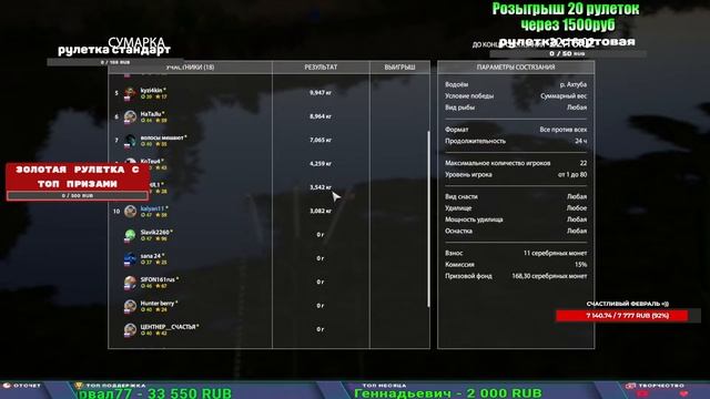 Поддержка донатом https://new.donatepay.ru/@1032463 Альтернативный донат https://www.donationalerts.com/r/kalyamba11 5536913964533059 карта Тинькоф Если стрим лагает,смотри стрим на трово https://trovo.live/s/Kalyamba_na_Ribalke Мой ВК - https://vk.com/kalyantv НИК в игре kalyan11 НАШ ДИСКОРД СЕРВЕР https://discord.gg/mSbnTJK8TB Заказ водоема на 1 час - 500р ( весь стрим 2500р ) Модерка на канале 1200р ( каждая следующая на 100р больше) Озвучка доната на 40р,50р,100р,200р,300р,500р,1000р ✅Призы в рулетке "ЗОЛОТАЯ" ✔ ЗОЛОТО ✔ ПРЕМ ✔ КАТУШКИ РАПТОР 40, АЗИМУТ 10000, СИЛЬВЕР 80, ТАЙГА с 30 ✔ ПАЛКИ ПИЛКЕРНАЯ, ДОНКА МОРСКИЕ, ✔ РОД ПОД, СТУЛЬЯ ✅Призы в рулетке СТАНДАРТ : ✔ катушка "РАПТОР 40" ✔ катушка "АЗИМУТ 10000" ✔ катушка "ТАЙГА С30, С40," ✔ катушки 60 для медного ( ЭВИИ, НАТОРЫ, ГОЛДА, и тд) ✔ ПИЛКЕРНОЕ УДИЛИЩЕ КОРОЛЕВА ОКЕАНА ✔ Морское Донное удилище ✔ прем ( 3, 7, 30 дней) ✔ золото ( 1, 3, 5, 10, 20 ,50) ✔ билет на море ( 1, 3, 5 дней) ✔ голд наживка и др. ✅Призы в рулетке "СТАРТОВАЯ" ✔ катушка "silver80" ✔ катушка "БЕЛЫЙ КАЛИБР" ✔ катушка "Черный калибр" ✔ катушка "Протон" ✔ катушка "Нарга 6000" ✔ Набор Фидерист и спинингист ✔ Карповик Фортуна ✔ фидерные удилища ✔ прем, золото, алкашка, наживки и тд P.s Рулетка это не казино, а награда за поддержку стримера. Вечный ТОП ПОДДЕРЖКИ (11.05.2024) 1. Dimon_pokemonchik 119 784 2. Interceptor 75 508 3. Skreb79 71 261 4. une personne 68 619 5. Нарвал77 31 550