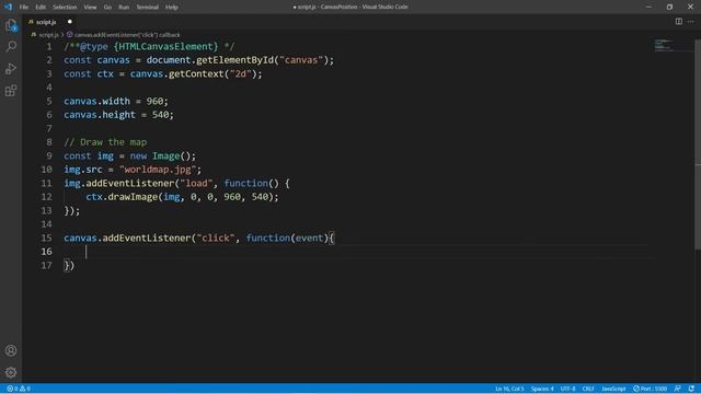 How to get the click position on an HTML5 Canvas? In this video you will learn how to get the coordinates of a click on a canvas. We use the addEventListener JavaScript function with type click, to detect where a user clicks on a map. At the clicked x and y coordinate, we draw a small red circle. Want to learn more about drawing circles on a canvas? Check out this video: https://www.youtube.com/watch?v=kF3AjQ1gb5E