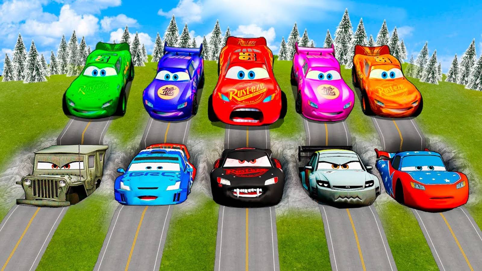 ГОНЩИКИ МЧАТЬСЯ ПО СЛОЖНОЙ ПОЛОСЕ ПРЕПЯДСТВИЙ ТАЧКИ МОЛНИЯ МАККУИН