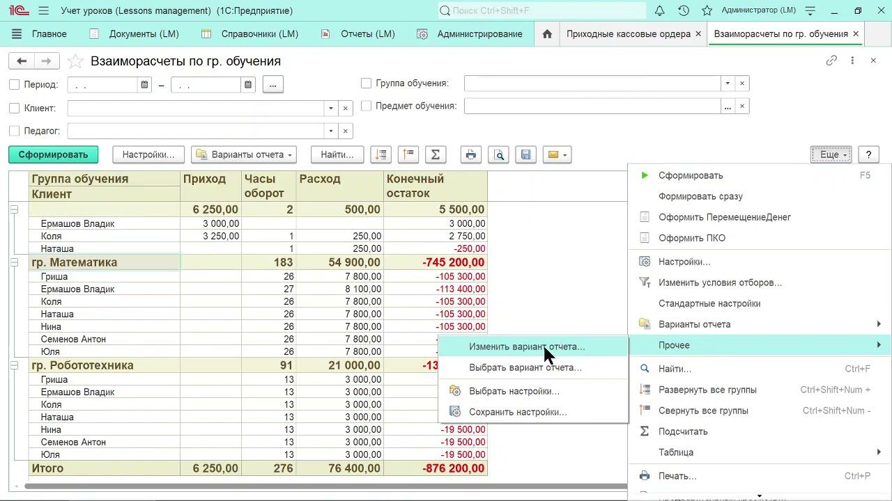 Учет занятий и уроков в 1С: 8.3. Настройка отчетов