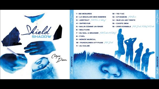 Album Carpe Diem de Shield Shadow tout est fait maison avec les moyen du bord c'est bien pour ça que l'album est gratuit j'ai vraiment essayé de varier les thèmes et les flow j’espère que ça vous plaira..... CARpe diem CAR nostalgique on essaie d'aller de l''avant et ça donne cet album.... Mc's présent dans les feats: Deal, Ken2skibouj, Kesto G, Oner et Snàke..... Cover réalisé par Cindy Bruneau..... Instrumentale faite par 2deep, Allrounda production, Anno domini beats, Dee-rhyme, 4klassix, S2keys, Pasco hitmaker, Draw beats, Tunna beatz et How High part2 de Method Man et Redman.....Tracklisting et assemblage des sons sur une seule piste réalisé par Snàke Time code : 00:00 "32 mesures" 02:48 "Le bouclier des ombres" 07:09 "Abstrait feat ken2" 09:31 "Imprévus" 13:05 "Malin comme un singe" 16:16 "Solitaire 19:28 "Du mal a grandir feat snàke et kestoG" 23:18 "Fidel" 26:43 "Monde musical" 29:21 "Punchline attitude feat Deal" 34:11 "Au calme" 39:11 "Tic-tac" 42:51 "Éphémère feat Öner" 46:43 "Sur un air triste" 50:16 "Carpe diem" 54:29 "Irréversible feat Deal, Snâke et KestoG"