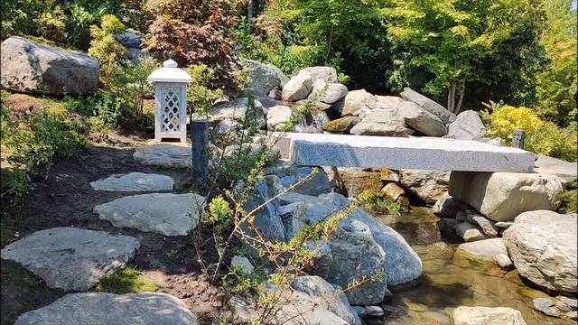 В саду много водопадов и есть прекрасный пруд с мостиком.