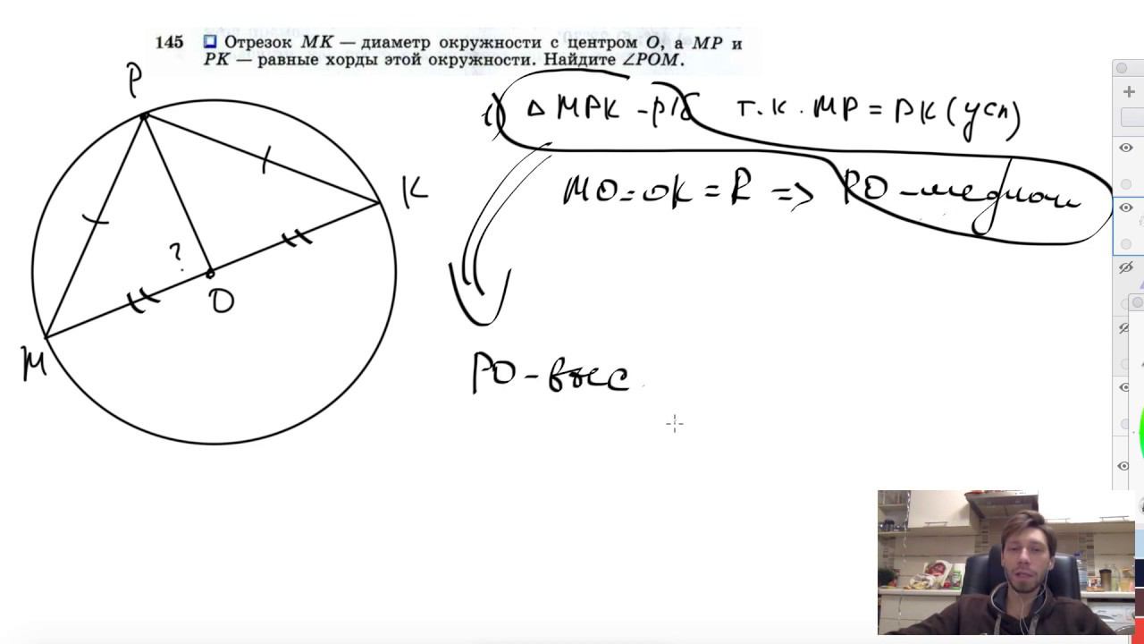 №145. Отрезок МК — диаметр окружности с центром О, а МР и РК — равные хорды этой окружности. Найдите ∠POM. Поддержать канал рублём - 5469400944002125 (Сбербанк) Мой второй канал для подготовки к ЕГЭ и ОГЭ - https://www.youtube.com/ЕвгенийСумин Инстаграм - https://www.instagram.com/EGE_OGE.math Личный инстаграм - https://www.instagram.com/ee_sumin VK - https://vk.com/evgeniysumin FB - https://www.facebook.com/EvgeniySumin