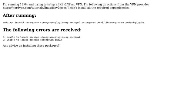 Ubuntu: Trouble setting up IKEv2/IPsec on 18.04 - Unable to locate package strongswan-ikev2
