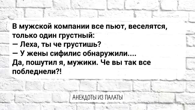 Сборник Смешных Анекдотов! Выпуск 23 00:03 Внук и бабушка • Бабушка зовёт внука есть, он идёт на кухню. • Бабушка занимает его место за компьютером. 00:19 Медосмотр призывников • Врач просит призывника прочитать текст в таблице, но тот не видит таблицы. • Врач объявляет призывника годным. 00:36 Дед и «Титаник» • Дед предсказал, что «Титаник» утонет, но его не послушали. • Его избили и выгнали из кинотеатра. 00:56 Мужская компания • В компании один человек грустит, его спрашивают почему. • Он шутит, что у жены обнаружили сифилис. 01:12 Жена офицера • Жена офицера жалуется командиру на измену мужа. • Командир находит женские трусы в кармане мужа. • Из-за тревоги командир откладывает разбирательство. 01:38 Возвращение командира • Командир возвращается домой после тревоги. • Жена спрашивает о зарплате, он отвечает, что деньги в кармане. • Жена находит деньги и трусы в кармане мужа и шутит.