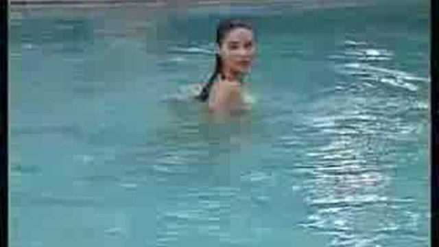 Девушка купается в воде дворового бассейна.