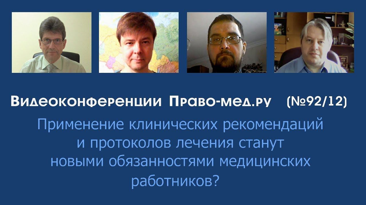 Видеоконференция Право-мед.ру № 92 (12) от 26 апреля 2018 года, на которой обсуждалось внесение в Государственную Думу законопроекта о применении клинических рекомендаций при оказании медицинской помощи Тема: Применение клинических рекомендаций и протоколов лечения станут новыми обязанностями медицинских работников? Рассмотренные вопросы 1. Кому нужны клинические рекомендации (протоколы лечения)? 2. Прогноз влияния на обеспечение надлежащего качества и безопасности медицинской помощи 3. Будут ли у медицинских организации ресурсы (возможности) для применения клинических рекомендаций (протоколов лечения) медицинскими работниками в полном объеме? Участники: Панов Алексей Валентинович, главный редактор информационного портала Право-мед.ру, г. Омск , член АЮР Печерей Иван Олегович, доцент кафедры судебной медицины и медицинского права МГМСУ им. И. А. Евдокимова, г. Москва Карпенко Андрей Александрович, руководитель Московского филиала "Центра медицинского права" Гаганов Дмитрий Борисович, юрист в сферы медицины, г. Санкт-Петербург