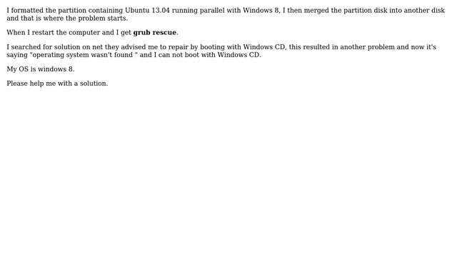Ubuntu: grub rescue when trying to fix dualboot with Windows 8, what can I do? Helpful? Please support me on Patreon: https://www.patreon.com/roelvandepaar With thanks & praise to God, and with thanks to the many people who have made this project possible! | Content (except music & images) licensed under cc by-sa 3.0 | Music: https://www.bensound.com/royalty-free-music | Images: https://stocksnap.io/license & others | With thanks to user user189750 (https://askubuntu.com/users/189750), user SimplySimon (https://askubuntu.com/users/155853), user Eliah Kagan (https://askubuntu.com/users/22949), user Anirudh Pulikonda (https://askubuntu.com/users/186911), and the Stack Exchange Network (http://askubuntu.com/questions/340845). Trademarks are property of their respective owners. Disclaimer: All information is provided "AS IS" without warranty of any kind. You are responsible for your own actions. Please contact me if anything is amiss at Roel D.OT VandePaar A.T gmail.com.