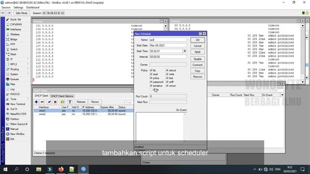 WMS adalah singkatan dari Wifi Managed Service dimana ini merupakan layanan internet khusus wifi dari telkom yang memungkinkan pelanggan memiliki 2-3 ssid, yang mana salah satu nya adalah ssid pemilik, dan dua lainnya adalah ssid @wifi.id dan seamless@wifi.id. Script Multi Auto Login mempermudah pelanggan wms untuk selalu terhubung dengan wms wifi id , tanpa kewatir akah internet RTO / DC ketika meminta login ulang jaringan wms wifi id. Untuk menjalankan multi auto login wms wifi id + LB Load balancing ECMP diperlukan sebuah router mikrotik bisa rb941ui , rb971ui , rb951ui, rb951ui , sxt, ldf, lhg, DLL SCRIPT MULTI AUTO LOGIN DISINI https://drive.google.com/file/d/1d2WH9t9Deh2DDrFMty6M3G7RWq_-YeOn/view?usp=sharing ECMP (Equal Cost Multi Path) ECMP atau Equal Cost Multi Path adalah metode load balancing yang menggunakan metode per address-pair connection load balancing. ECMP memungkinkan router untuk memiliki lebih dari satu gateway untuk satu network tujuan. Karena metodenya adalah per address-pair connection, maka sistem load balancing ini adalah setiap address yang berbeda di koneksi yang berbeda akan berkemungkinan melewati gateway yang berbeda. https://buananetpbun.github.io/ecmp.html facebook = https://www.facebook.com/wonobyte instagram = https://www.instagram.com/wonobyte_info email = wonobyte@gmail.com