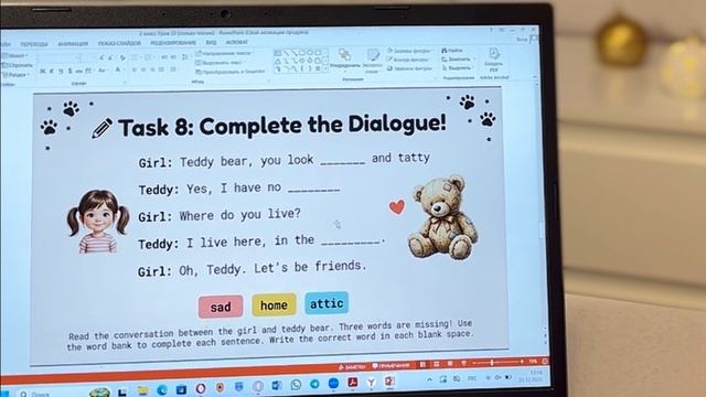 Презентация, Английский язык, 2 класс, урок № 33 “Teddy bear!” Содержание: Task 1. Прослушай фразы, найди и отметь ниже их правильный перевод Task 2. Прослушай диалог, найди правильный перевод фраз девочки и бабушки Task 3. Прослушай слова и повтори за диктором каждое слово Task 4. Напиши слова под диктовку диктора Task 5. Найди 5 слов по теме «Teddy bear» Task 6. Найди лишнее слово и подчеркни его Task 7. Прочитай диалог и зачеркни лишнее слово, данное в скобках Task 8. Прочитай диалог. Напиши пропущенные слова Task 9. Допиши предложения Task 10. Прочитай текст и напиши пропущенные слова Task 11. Прочитай текст. Подчеркни правильный ответ Task 12. Прочитай слова девочки и произнеси слова бабушки Task 13. Произнеси слова девочки и прочитай слова бабушки Материал создан для комплексного решения образовательных задач в рамках одной темы: Предметные: Активное усвоение тематической лексики, развитие навыков аудирования и чтения, тренировка устной речи. Метапредметные: Развитие внимания, памяти, логического мышления и коммуникативных УУД через работу в парах и группах. Личностные: Повышение мотивации к изучению языка, создание положительной атмосферы на уроке. Учебочка.рф - платформа для преподавателей и методистов, где можно не только приобрести полезные материалы, но и разместить свои на продажу.