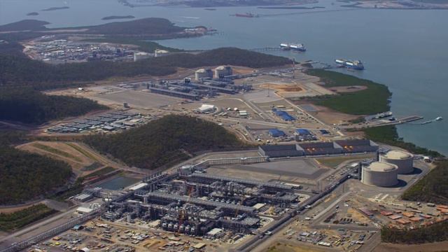 Aerial vision of the three Curtis Island LNG projects using a Cinoflex video camera mounted to the nose of a helicopter. All three projects are now operational following the Australia Pacific LNG plant announcement that it had reached its first cargo milestone on January 9.