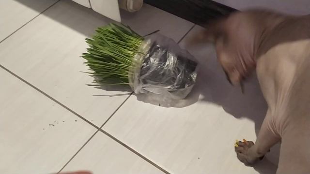 Донской сфинкс Нубик кушает травку
