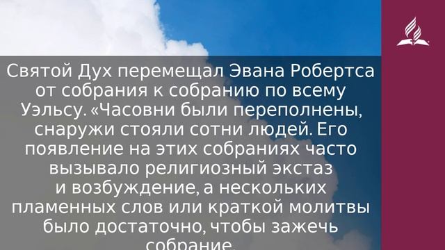 И пришел он по вдохновению в храм (Лк. 2:27). Святой Дух движет людьми не только в духовном смысле, но, если необходимо, и физическим образом. Симеон был побужден прийти в храм, чтобы увидеть там принесенного Младенца Иисуса. Филипп был перемещен в другое место после того, как крестил эфиопского вельможу. Илия был вознесен на небо в огненной колеснице. После того как Эван Робертс в 1904 году был помазан Духом в Блинанерче, в Уэльсе, сразу же этот Дух привлек его к служению. «С тех пор, — говорил он, — спасение душ стало желанием моего сердца. С того времени во мне горит стремление идти по всему Уэльсу» (Stephen Olford, Heart-Cry for Revival, p. 113). Дух без промедления послал Эванса в его дом в Логхор, где он начал проводить молитвенные собрания, «на которые в течение нескольких дней собирались большие толпы людей, пока дух пробуждения не охватил всю окрестность» (там же). Святой Дух перемещал Эвана Робертса от собрания к собранию по всему Уэльсу. «Часовни были переполнены, снаружи стояли сотни людей. Его появление на этих собраниях часто вызывало религиозный экстаз и возбуждение, а нескольких пламенных слов или краткой молитвы было достаточно, чтобы зажечь собрание. Люди пели, делились своими духовными опытами, затем следовала молитва, а потом снова пение» (там же, c. 114). Иосиф Кемп, пастор церкви Шарлотты в Эдинбурге, был побужден Святым Духом посетить собрания в Уэльсе. Послушайте его рассказ: «Я провел две недели, наблюдая, участвуя, впитывая эту атмосферу, исследуя свое сердце, сравнивая мои методы с методами служения Святого Духа; а затем я вернулся в свою церковь в Эдинбурге, чтобы рассказать, что я видел» (там же, c. 114, 115). Пробуждение быстро охватило всю Шотландию. Результаты были поразительными. Церкви не только заполнились, но, как засвидетельствовал Кемп, «молодые и пожилые обрели новую любовь к Библии. Времени не хватит, чтобы рассказать об очищенных жизнях, измененных семьях и просветленных взглядах сотен людей» (там же, c. 116). Это и есть движение Духа. Господь желает, чтобы мы были его участниками. МОЛИТВА Господь любви! Я прошу сегодня, чтобы Ты помог мне быть точно там, где Ты сможешь использовать меня в деле пробуждения и реформации. https://esd.adventist.org/library/periodicals/ezhednevnyie-chteniya/ #адвентисты #АдвентистыСедьмогоДня #Церковь #ЦерковьАдвентистовСедьмогоДня #ЦерковьХристианАдвентистовСедьмогоДня