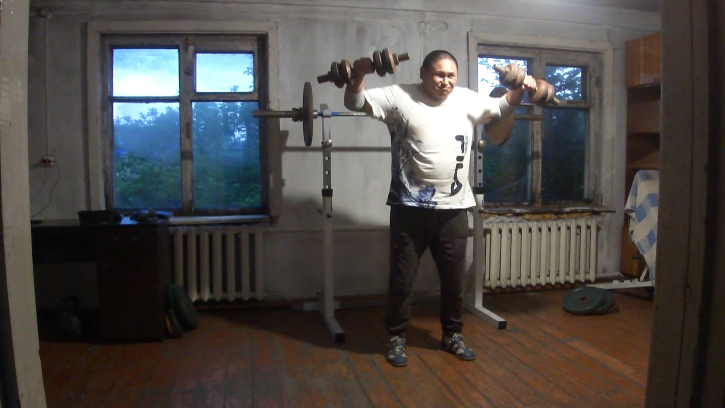 12. Жим стоя, тяга, бицепсы и развод гантелей