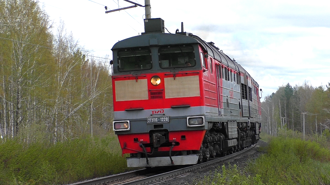 Тепловоз 2ТЭ116-1220 следует резервом по перегону Сысерть - Мраморская. Свердловская ЖД. Свердловская область, Россия. Приписка: ТЧЭ-7 Тюмень имени В.Ф. Соснина. 19.05.2024