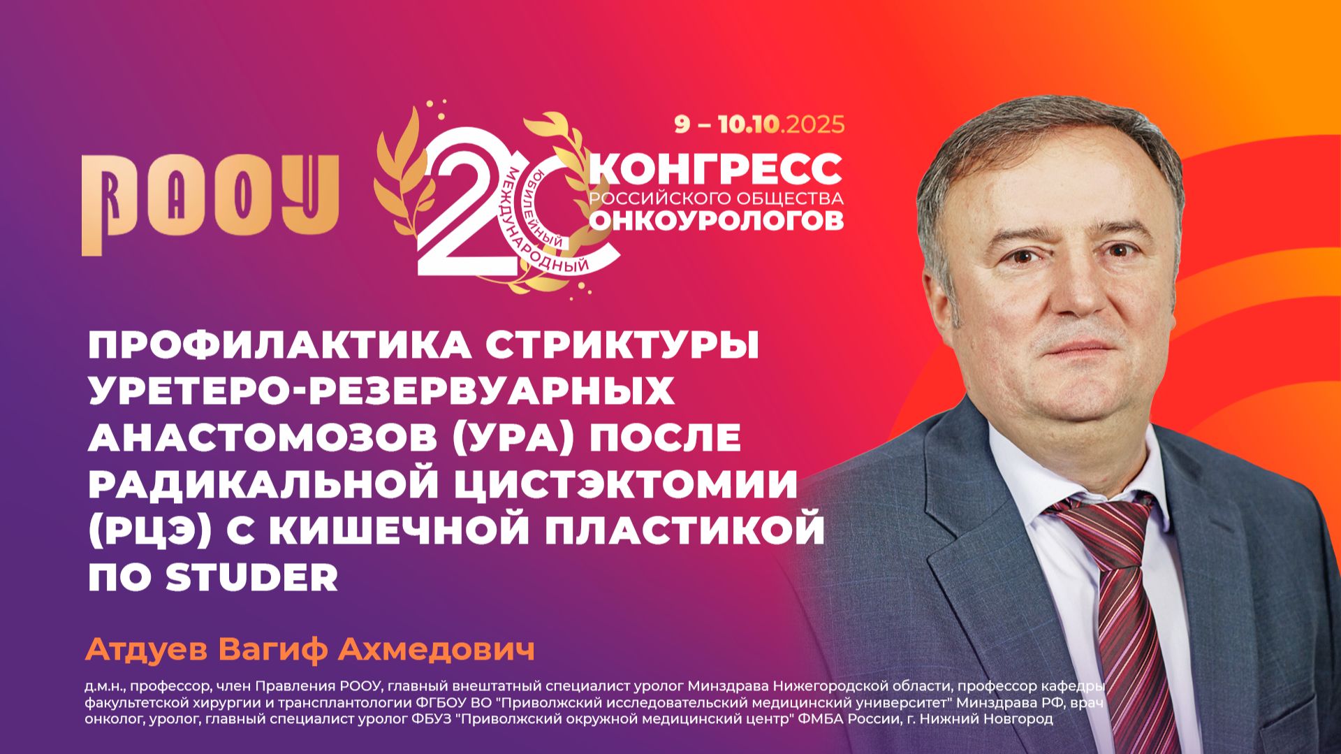 10 октября на XX Международном Конгрессе РООУ Атдуев Вагиф Ахмедович представил доклад на тему: "Профилактика стриктуры уретеро-резервуарных анастомозов (УРА) после радикальной цистэктомии (РЦЭ) с кишечной пластикой по Studer". ✅ Эксперт: Атдуев Вагиф Ахмедович, профессор, член Правления РООУ, главный внештатный специалист уролог Минздрава Нижегородской области, профессор кафедры факультетской хирургии и трансплантологии ФГБОУ ВО “Приволжский исследовательский медицинский университет” Минздрава России, врач-онколог, уролог, главный специалист уролог ФБУЗ “Приволжский окружной медицинский центр” ФМБА России, г. Нижний Новгород. ➡️ Официальный сайт РООУ: https://roou.ru/ Присоединяйтесь к нам в социальных сетях. Делитесь мнением и повышайте уровень теоретической и практической подготовки в онкоурологии: Telegram: https://t.me/oncologyurology ВКонтакте: https://vk.com/oncologyurology #РООУ #RAOU #ОбществоОнкоурологов #Онкоурология #Урология #Онкология #Oncourology #XXКонгрессРООУ #КонгрессРООУ #ракпочки #медицинскиеконференции #urology