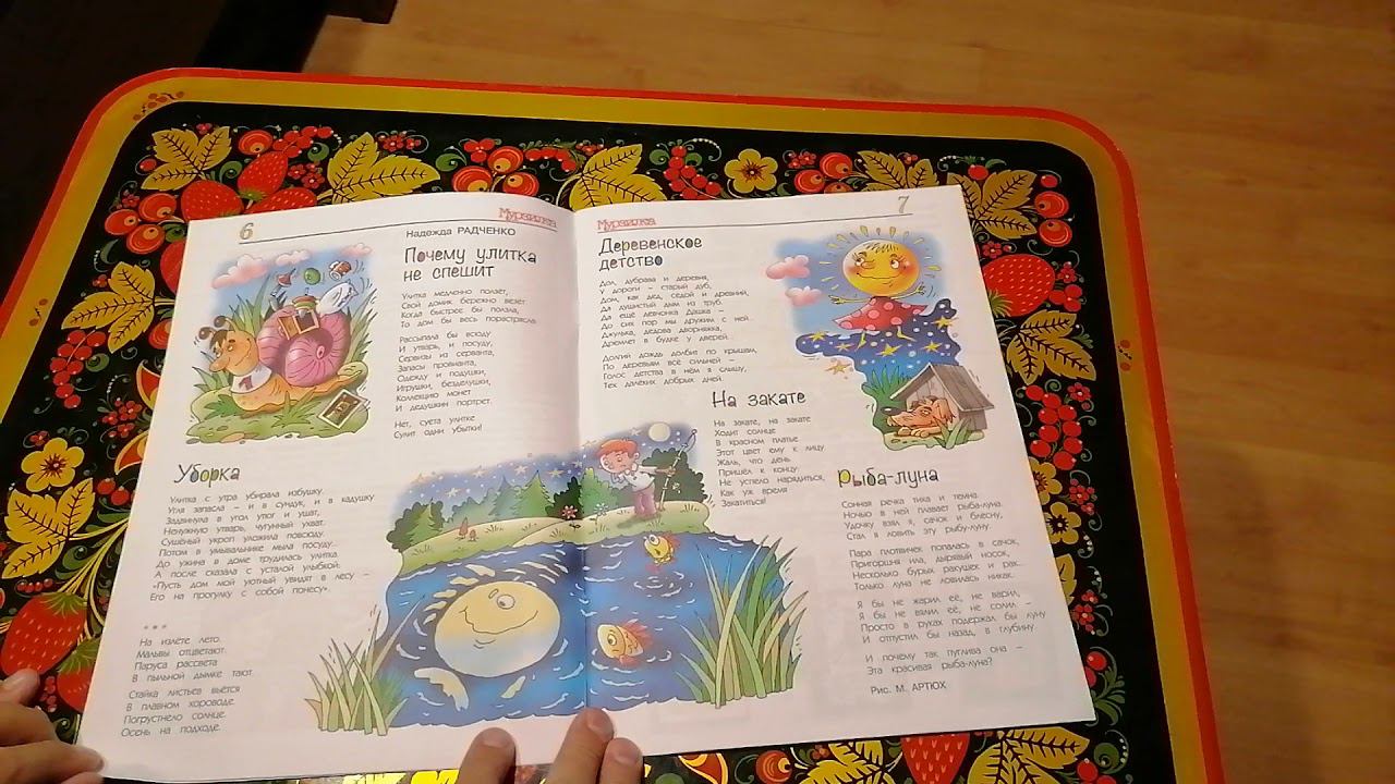 Журнал "Мурзилка". № 8. Август 2021 год. 6 страница. Стихи. Надежда Радченко. Уборка. Почему улитка не спешит. Деревенское детство. На закате. Рыба-луна.