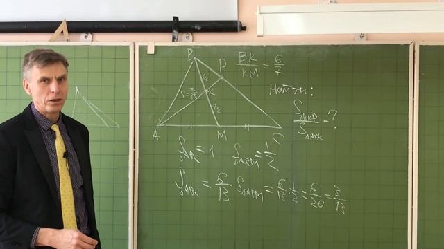Математика, найти отношение площадей треугольников. Задача на свойства площадей + теорема Фалеса