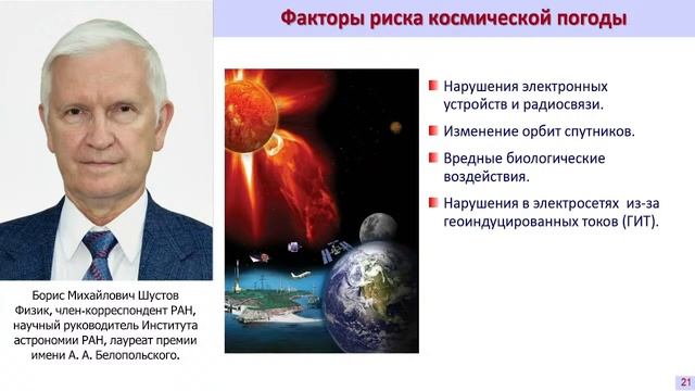 Одно из главных условий выживания и успешного развития человечества – умение прогнозировать наиболее существенные риски и способность парировать угрозы, связанные с этими рисками. Это - важнейшая задача науки и техники. Развитие человеческой цивилизации сопровождается углублением понимания и мира, в котором мы живём, и самого человека. При этом выявляются новые, ранее неизвестные угрозы. К таким угрозам можно отнести и космические угрозы: Космический мусор - катастрофическое техногенное засорение ближнего космоса, представляющее угрозу сокращения или даже прекращения космической деятельности человечества. Космическая погода - плохо прогнозируемые изменения активности Солнца, представляющие угрозу серьёзных потерь, прежде всего в сфере производственной деятельности (в энергетике, связи и др.). Астероидно-кометная опасность (АКО) угроза столкновения Земли с малыми телами Солнечной системы (астероидами и кометами) с причинением серьёзного ущерба населению планеты вплоть до уничтожения цивилизации. Биологическая угроза обусловлена как опасностью занесения на Землю внеземных (или земных, но изменившихся из-за пребывания в космосе) форм жизни так и выносом человеком различных организмов в космос с возможным «заражением» нашими формами жизни других тел Солнечной системы; Астрофизические угрозы – наиболее экзотический, но тем не менее реальный вид угроз. Его связывают с возможностью различных катаклизмов «межзвёздного» масштаба. В лекции рассказывается о том, как учёные изучают такие угрозы и продумывают пути их парирования. Именно с ними Вас ближе познакомит Борис Михайлович Шустов —д.ф.-м.н., профессор, чл.-корр РАН, научный руководитель Института астрономии РАН, председатель секции «Внеатмосферная астрономия» Совета РАН по космосу председатель экспертной группы «Космические угрозы» Совета РАН по космосу научный руководитель проекта космической обсерватории «Спектр-УФ»
