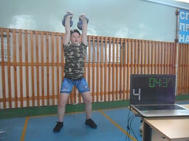 Гиревой спорт. Кузнецова Дарья 2005 года рождения 3 этап Онлайн Кубка мира. Упражнение Толчок 2-х гирь по Длинному Циклу 12 кг 5 минут 23.03.2021 года. Результат 49 подъёмов.