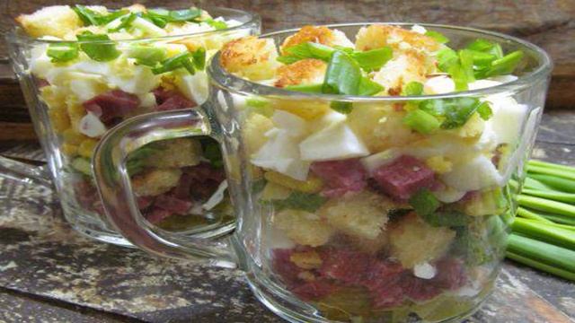 Слоеный салат с сухариками и копченой колбасой