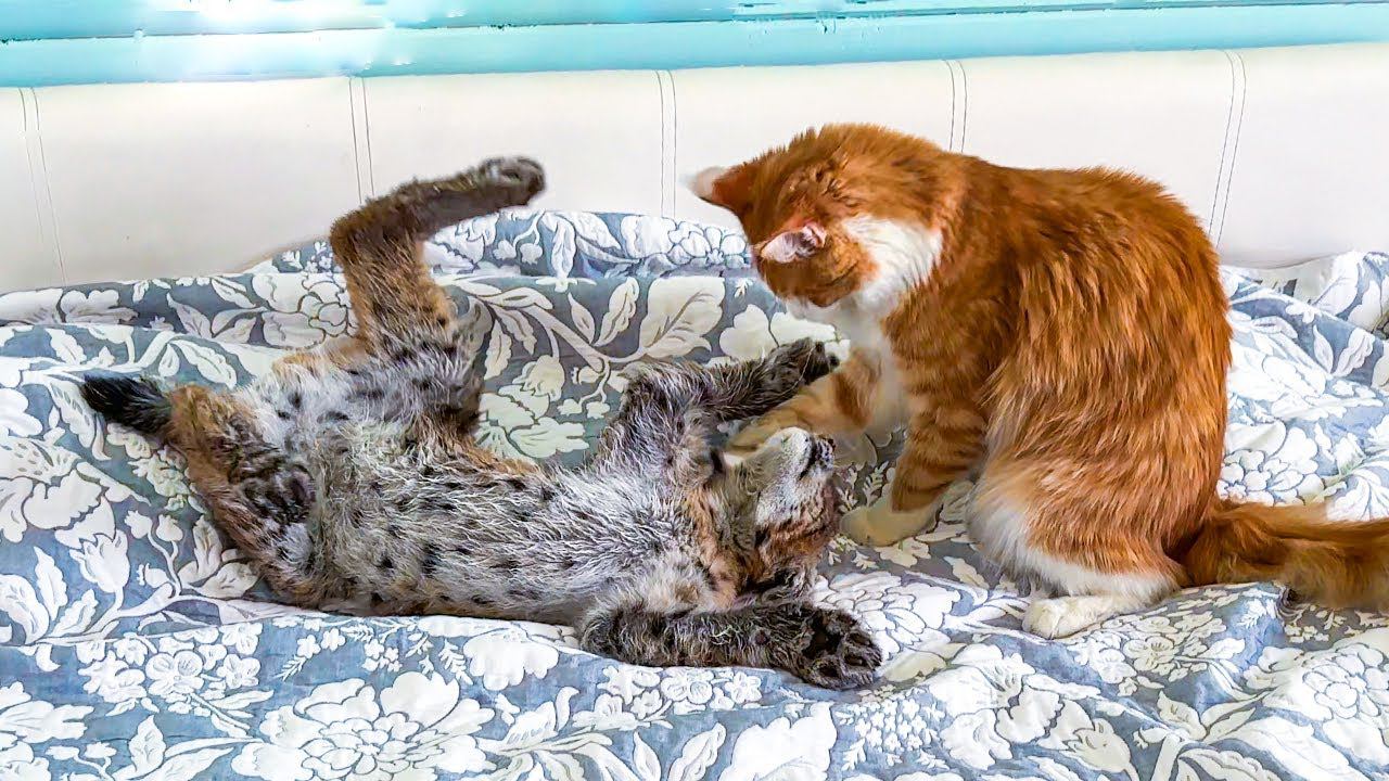 РЫСЕНОК ПРОБРАЛСЯ В СПАЛЬНЮ И ПРОКАЗНИЧАЕТ, А МЕЙН-КУН ЕГО ВОСПИТЫВАЕТ