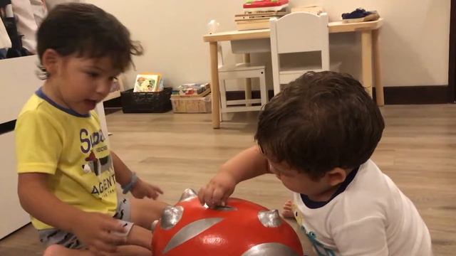 Hugo y Nicolas metiendo monedas en el Chanchito