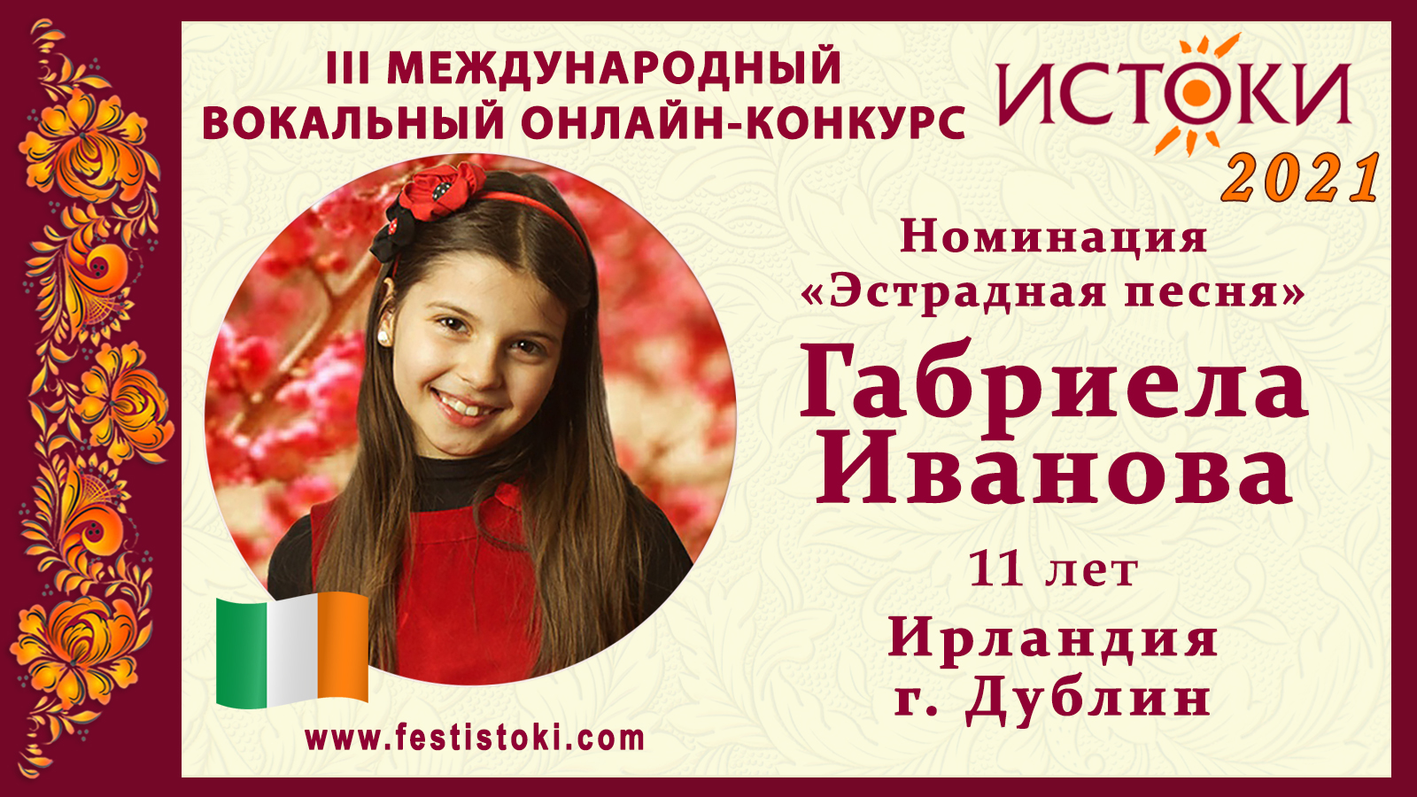 Лауреат III степени III Международного вокального онлайн-конкурса «Истоки». Номинация "Эстрадная песня". Песня "Something’s got a hold on me" By Christina Anguilera. Автор Etta James. Сайт: www.festistoki.ru / www.festistoki.com E-mail: festistoki@mail.ru