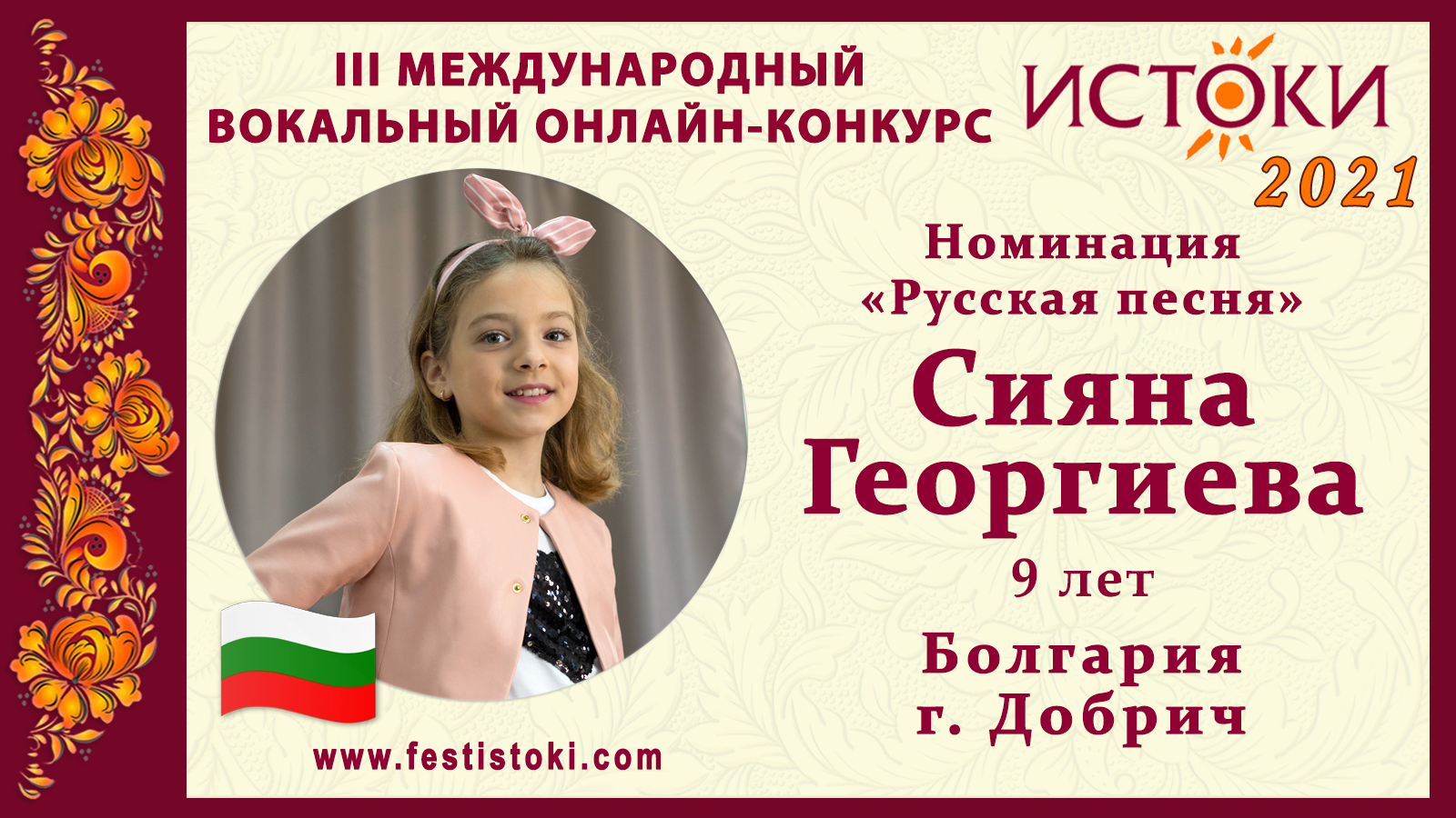 Дипломант III Международного вокального онлайн-конкурса «Истоки». Номинация "Русская песня". Песня "Три желания/Лягушка" Музыка Франсис Лемарк (Francis Lemarque), русский текст: Самюил Болотин. Сайт: www.festistoki.ru / www.festistoki.com E-mail: festistoki@mail.ru