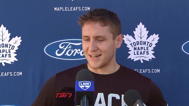 Travis Dermott speaks to the media following practice on Tuesday.