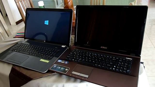Windows 10 is fast, but a hybrid SSD Hard drive helps a lot. Here are the specs of both machines: ASUS K73SV (Winner): Processor Intel® Core™ i5 2410M 8 GB SDRAM DDR3 1600Mhz Graphic: NVIDIA GeForce® GT 540M with 1GB DDR3 VRAM 500GB 7200rpm Seagate momentus XT Solid State Hybrid Drive ST95005620AS. HP Pavilion 17-e113dx Processor:1.9GHz up to 2.8GHz AMD Quad-Core A8-4500M Accelerated Processor Memory 6GB DDR3L SDRAM 1600Mhz Graphics AMD Radeon HD 7640G Hard Drive 750GB 5400RPM