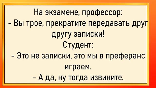 Как зять удивил тёщу 2 раза! Сборник свежих анекдотов! Юмор! 00:00 Испытания лекарства • Пациенты разделены на опытную и контрольную группы. • Один из пациентов подозревает замену препарата, потому что таблетки теперь тонут в унитазе. 00:21 Пьяный гаишник • Пьяный гаишник останавливает грузовик и спрашивает, что у него в машине. • Водитель отвечает, что посыпает дорогу солью из-за гололёда. 00:40 Разговор о мачо и титутке • Обсуждение, почему парень с множеством девушек считается мачо, а девушка с множеством парней — титуткой. • Аналогия с ключом и замком: если один ключ открывает много замков, это «офигительный ключ», а если к одному замку подходят все ключи, это «фиговый замок». 00:59 Тест на культурность • Муж приходит домой подвыпившим и предлагает жене пройти тест на культурность. • Вопросы теста: виды иностранной валюты, противозачаточных средств и рек в Исландии. 01:37 Урок электрика • Старый электрик учит молодого, как безопасно подходить к силовому кабелю: широкими шагами, чтобы раньше почувствовать разницу потенциалов. 02:07 Женщина на пляже • Старик восхищается красотой женщины на пляже, она отвечает, что холодна как рыба. • Старик мечтательно произносит: «Эх, и хорошо же в жаркую пару холодная рыба да под старыми руками». 02:33 Визит к врачу • Мужчина спрашивает врача о своём состоянии, врач советует ограничения в еде, алкоголе и физические упражнения. • Муж сообщает жене, что отдыхает. 02:52 Встреча с африканочкой • Один мужчина рассказывает о встрече с красивой девушкой, другой спрашивает, что было дальше. • Первый отвечает, что привёл её домой, они попили шампанского, потанцевали, поцеловались, но он её не нашёл. 03:17 Работа в милиции • Парень работает в милиции, но не получает зарплату. • Начальник спрашивает, почему он не получает зарплату, парень отвечает, что думал, что ему дали пистолет. 03:43 Конфликт в семье • Молодая жена звонит матери и жалуется на семейные конфликты. • Мать успокаивает её, говоря, что в каждой семье возникают первые споры. 04:05 Экзамен и преферанс • Профессор просит студентов прекратить