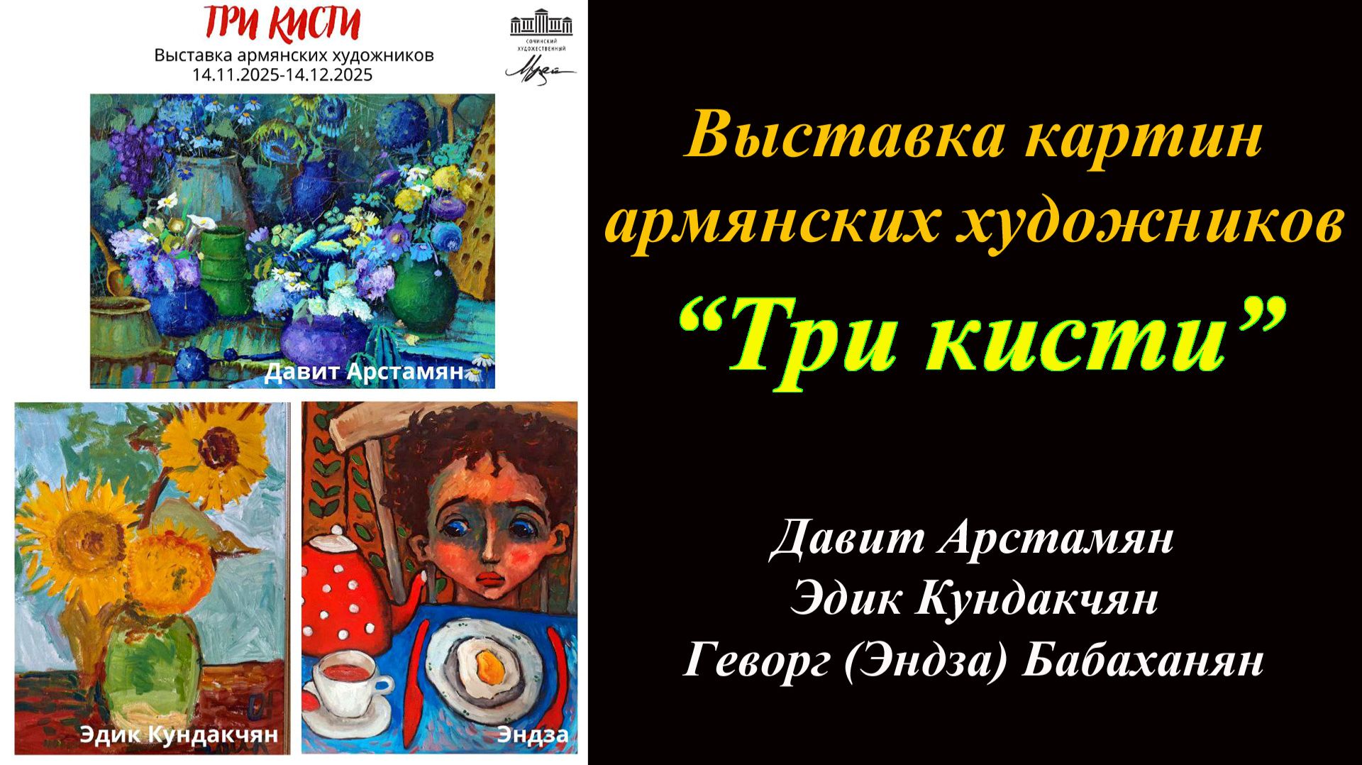 В Сочинском художественном музее им. Д.Д. Жилинского прошла совместная выставка Давита Арстамяна, Геворга Эндзы Бабаханяна и Эдика Кундакчяна. Три кисти в руках талантливых мастеров создали яркое и наполненное армянским колоритом пространство.