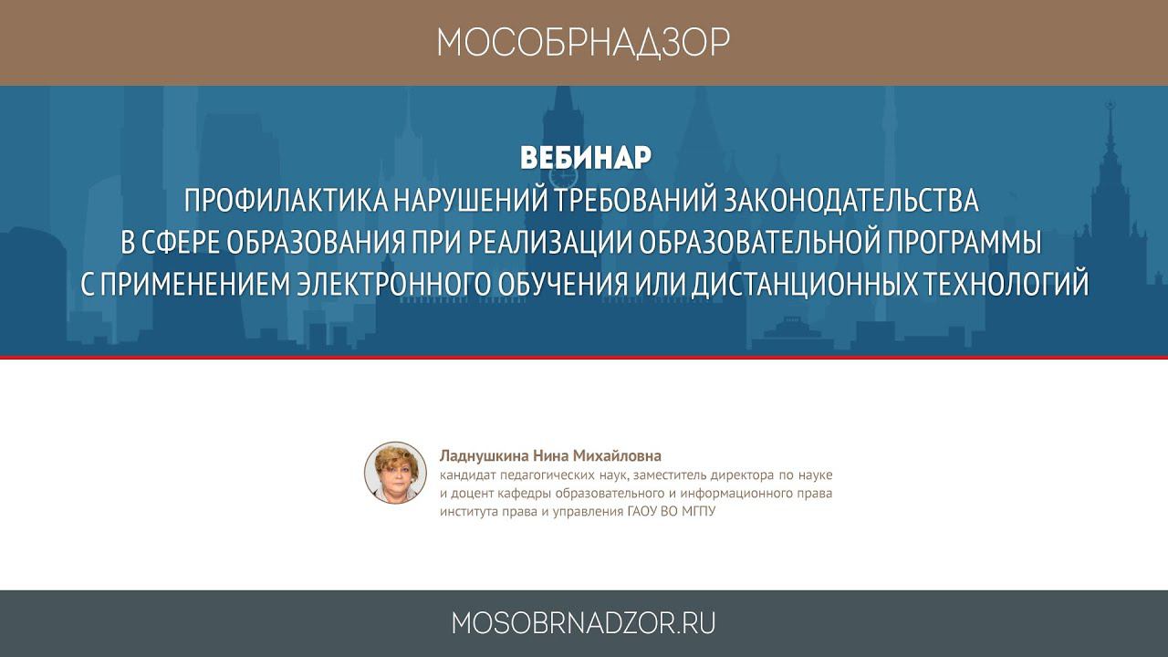 Вебинар «Профилактика нарушений требований законодательства в сфере образования при реализации образовательной программы с применением электронного обучения или дистанционных технологий» был проведен в рамках проекта Мособрнадзор.РФ 13 апреля 2020 года. Ведущая вебинара - Ладнушкина Н.М. Страница вебинара на сайте проекта - http://mosobrnadzor.ru/supervision/webinars/2020-04-13_14-00