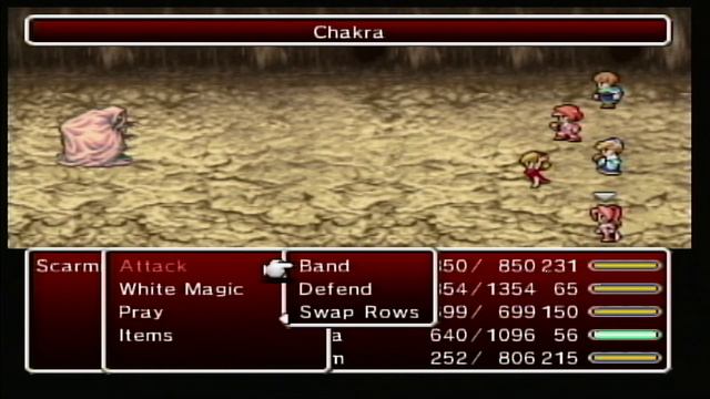 The MP management boss. The final form doesn't take damage from level 1 and 2 Black and White Magic spells. I'm forced to use bands to deal heavy damage with my mages. Cure is pointless in this fight and I shouldn't waste MP on it. I have Recover Rod and Pray for healing. I had to figure out which band to use on what form. Twincast is best for the first one and Sprit Bred for the second one. The first form doesn't absorb anything making the RNG Twincast easy to use. Palom 28 Recovery Rod Sages Miter Mage's Roe Protect Ring Luca 28 Battle Axe Dragon Shield Genji Helm Genji Armor Genji Gloves Leonora 26 Healing Staff Sage's Miter Sage's Surplice Rune Armlet Ursula 27 Metal Knuckles Lightning Claws Beret Kenpo Gi Rune Armlet Porom 28 Psycho Spiral Sage's Miter White Robe Rune Armlet Dr. Lugae: https://youtu.be/HrVoMLMgYSE Cagnazzo: https://youtu.be/5RZ1UFBTlUI