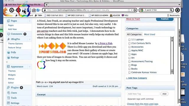 "Cool App" "Great Little Utility" "A perfect combination of form and function!" Highly visible locator instantly reveals your mouse position. Controllable trigger time period, from 1 second to 30 minutes. http://www.2point5fish.com Eliminates the frustrating search of your screen. Indispensable addition to Mac OS X, v10.4 or later required.