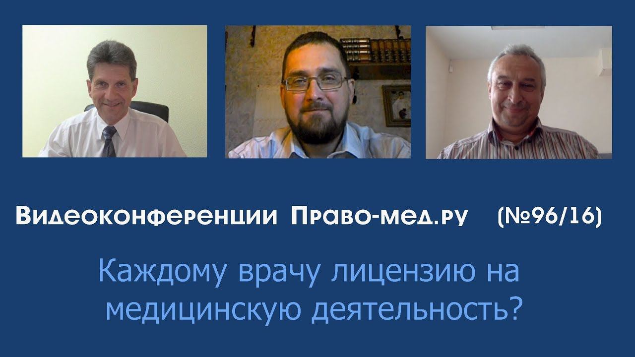 Видеоконференция Право-мед.ру № 96 (16) от 21 июня 2018 года с 11 МСК Тема: Каждому врачу лицензию на медицинскую деятельность? Рассмотренные вопросы: 1.Причины инициативы по обязательному лицензированию врачей 2. Врач с лицензией – субъект гражданско-правовых отношений, мотивированный на надлежащее качество и безопасность медицинской услуги? 3. Может ли инициатива реализована в рамках нового национального проекта по здравоохранению? Участники: Панов Алексей Валентинович, главный редактор информационного портала Право-мед.ру, г. Омск , член АЮР Гаганов Дмитрий Борисович, юрист в сфере медицины, г. Санкт-Петербург Васильев Игорь Валерьевич, доцент кафедры общественного здоровья и здравоохранения НГМУ, г. Новосибирск, член АЮР Новостное сообщение по ссылке http://pravo-med.ru/news/14155/