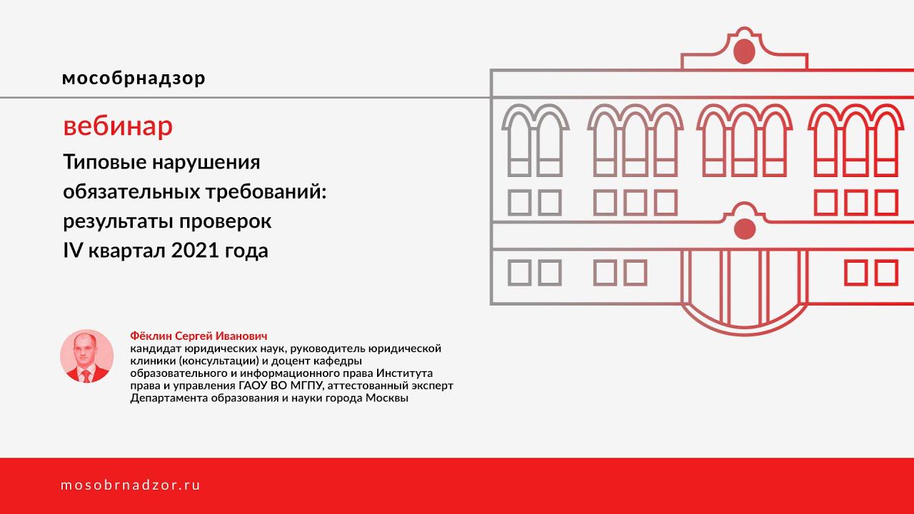 Вебинар «Типовые нарушения обязательных требований: результаты проверок IV квартал 2021 года» был проведен в рамках проекта Мособрнадзор.РФ 9 марта 2022 года. Ведущий вебинара - Фёклин С.И. Страница вебинара на сайте проекта - http://mosobrnadzor.ru/supervision/webinars/2022-03-09_16-30
