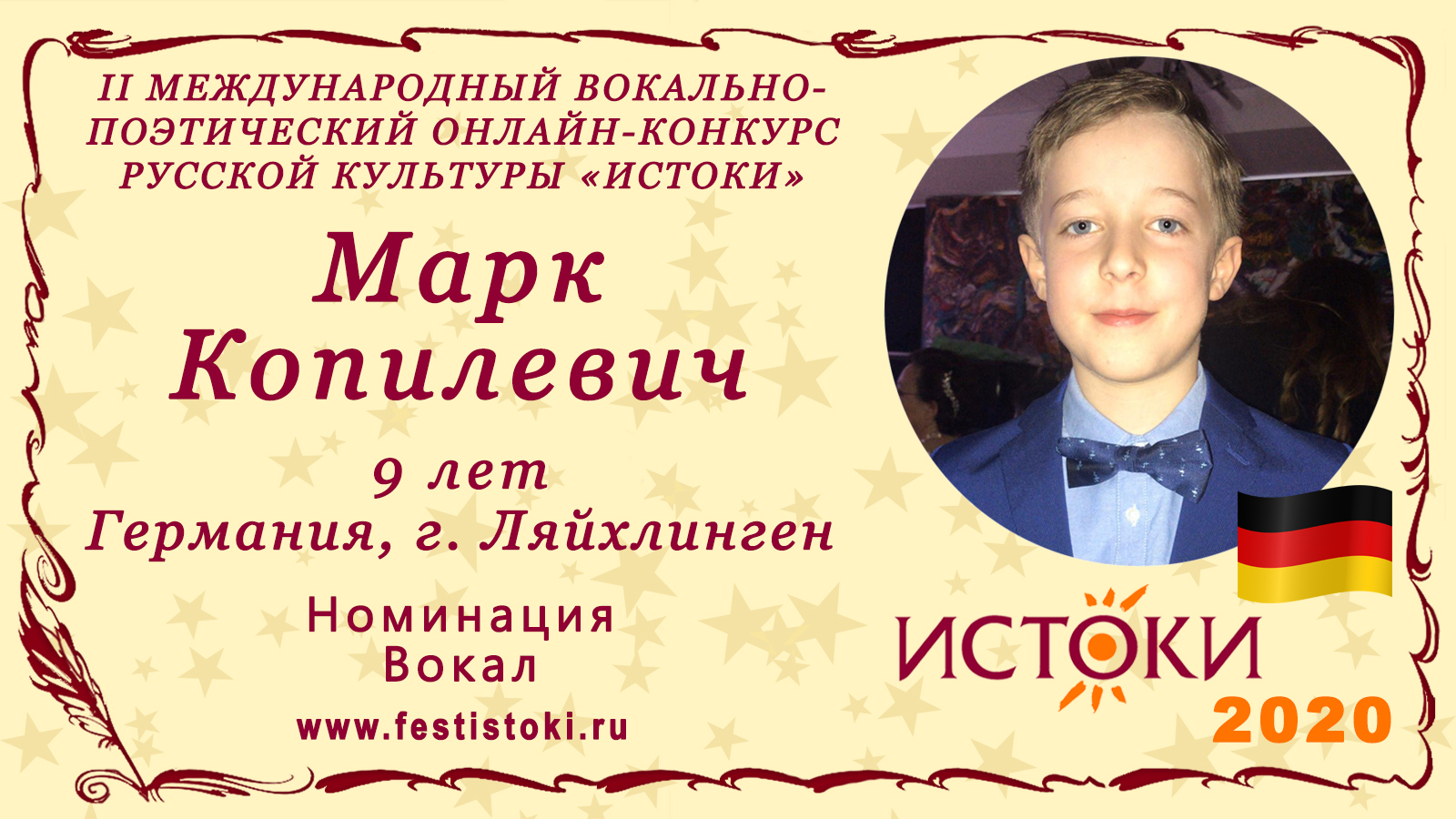 Участник II Международного вокально-поэтического онлайн-конкурса русской культуры «Истоки». Номинация - Вокал. Песня "Синяя вечность". Музыка Муслима Магомаева, слова Геннадия Козловского. Сайт: www.festistoki.ru / www.festistoki.com E-mail: festistoki@mail.ru