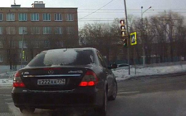 Отсутствие световых указателей при повороте и перестроении. Госномер нарушителя Х222АА 774. Перекрёсток пер. Советского и ул. Советской, ул. Советская. 23-01-2022 п. 8.1 ПДД - Перед началом движения, перестроением, поворотом ..... водитель обязан подавать сигналы световыми указателями поворота ...