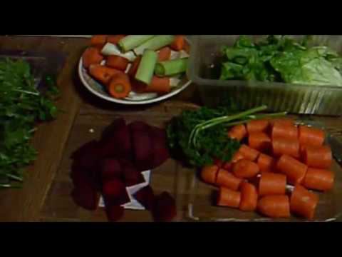 Морковь, свекла, томаты, лук-порей, сельдерей, петрушка, салат. По времени - полтора чаа. Результат - литр сока. Вкус - терпкий.