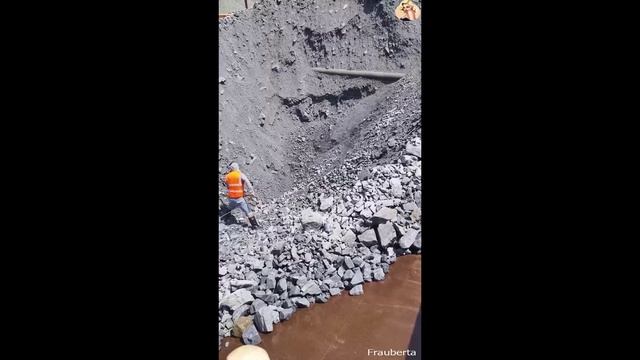 Строительство, разгрузка баржи со щебёнкой