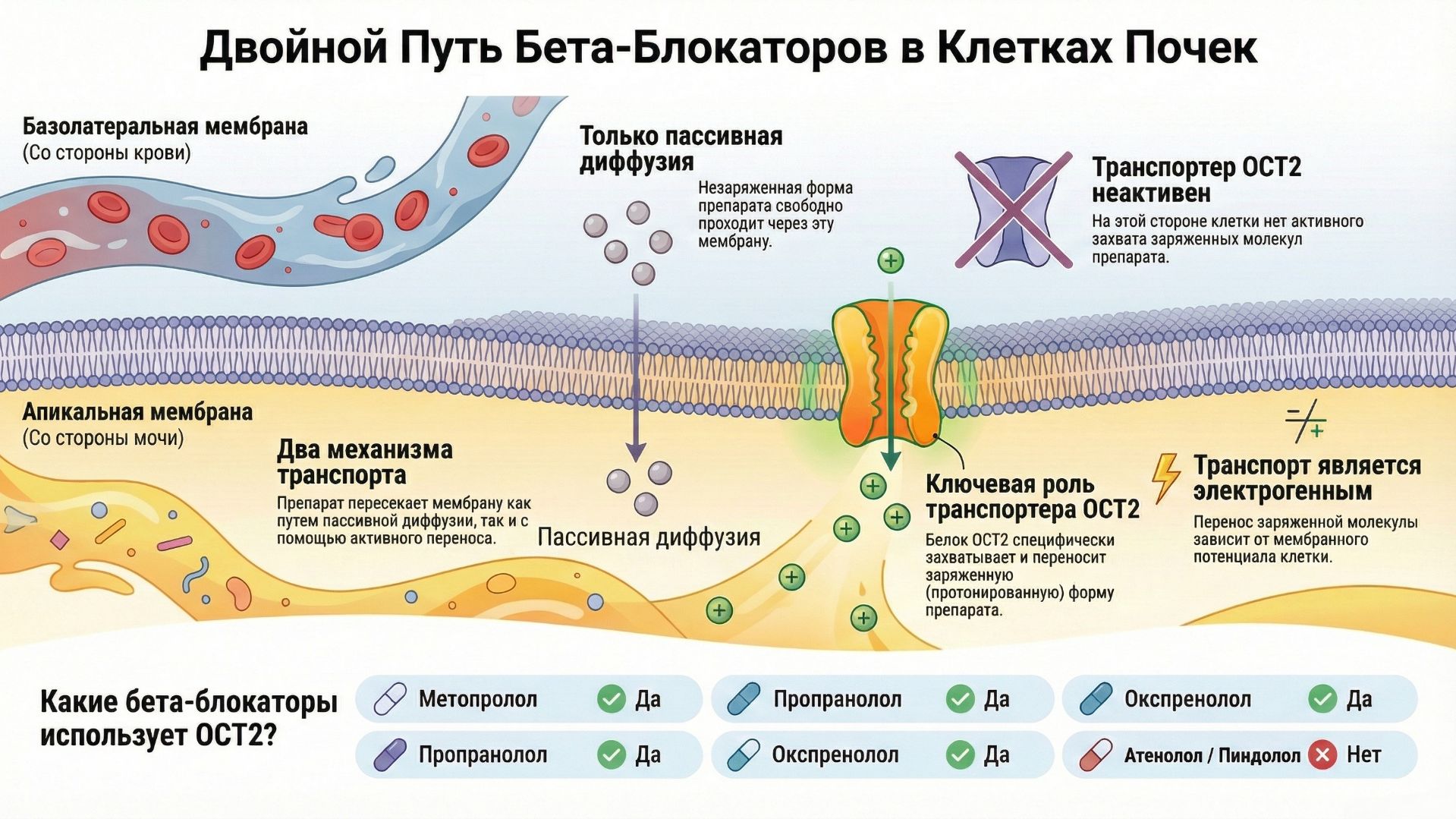 Транспортер органических катионов OCT2 опосредует поглощение антагонистов β- адренорецепторов через апикальную мембрану монослоев почечных клеток LLC-PK Br J Pharmacol. 2000 Sep;131(1):71–79. doi: 10.1038/sj.bjp.0703518 https://pmc.ncbi.nlm.nih.gov/articles/PMC1572285/ Метопролол, пропранолол и окспреналол: фармакокинетика через органический катионный транспортер 2 (OCT2) https://dzen.ru/a/aUR4lk-K1iSAvPru