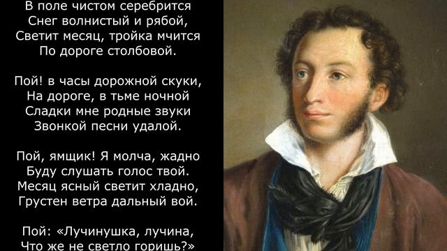 В поле чистом серебрится Снег волнистый и рябой, Светит месяц, тройка мчится По дороге столбовой. Пой! в часы дорожной скуки, На дороге, в тьме ночной Сладки мне родные звуки Звонкой песни удалой. Пой, ямщик! Я молча, жадно Буду слушать голос твой. Месяц ясный светит хладно, Грустен ветра дальный вой. Пой: «Лучинушка, лучина, Что же не светло горишь?» сгенерировано нейросетями SUNO, UDIO