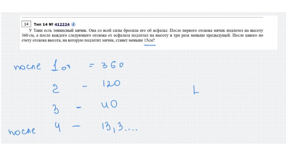 У Тани есть теннисный мячик. Она со всей силы бросила его об асфальт. После первого отскока мячик подлетел на высоту 360 см, а после каждого следующего отскока от асфальта подлетал на высоту в три раза меньше предыдущей. После какого по счету отскока высота, на которую подлетит мячик, станет меньше 15см? кидайте в комментарии задания, которые у вас не получаются, будем разбираться вместе) и вступайте в мой тг канал https://t.me/gornova_math