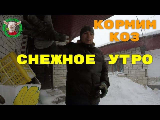 Снежное утро, кормим коз