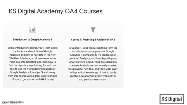 KS Digital Academy is launching 3 new courses specifically covering Google Analytics 4! In this video, instructor Krista Seiden tells you all about these courses and what you'll learn. For more information about all of our courses, visit https://academy.ksdigital.co Music: https://www.bensound.com